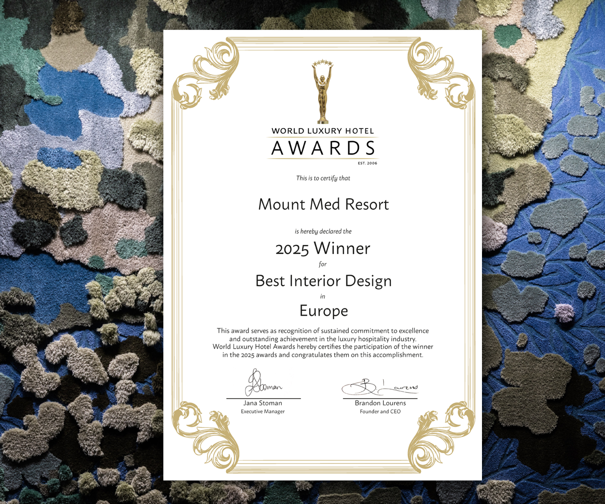 Mount Med Resort been named Continent Winner Europe in the Best Interior Design category at the prestigious 2025 World Luxury Hotel Awards. A recognition for the holistic design concept that unites art and nature, wellbeing and heritage, sustainable materials and artisan craftsmanship to offer a holistic experience that inspires and transforms.